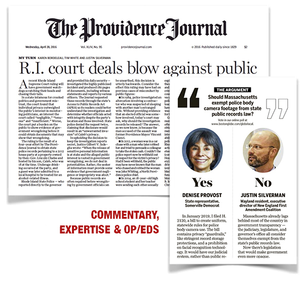 Just recently, The Boston Globe featured our executive director in a debate about whether or not police body camera footage should be exempt from the Massachusetts public records law. We have also written op/eds in The Providence Journal and Worcester Telegram & Gazette, among others.